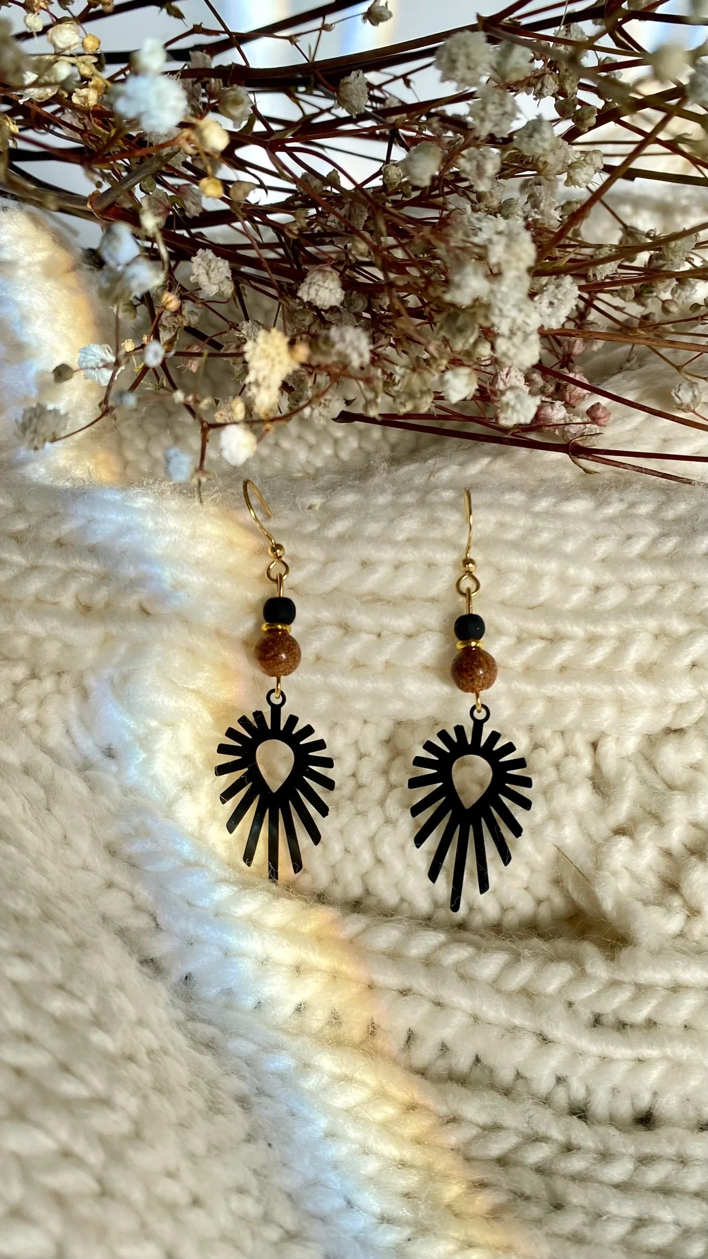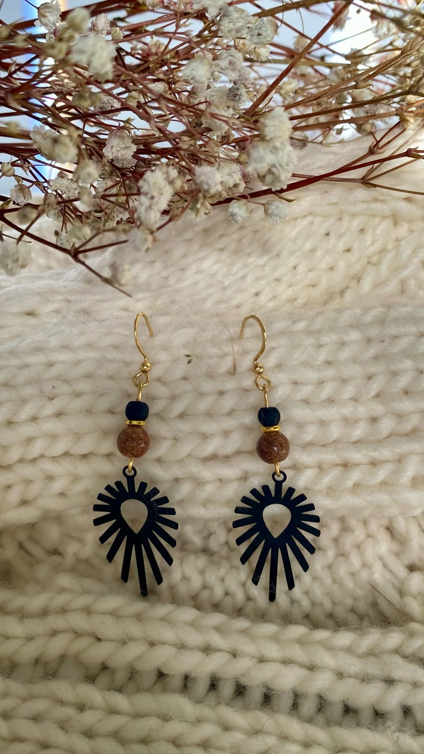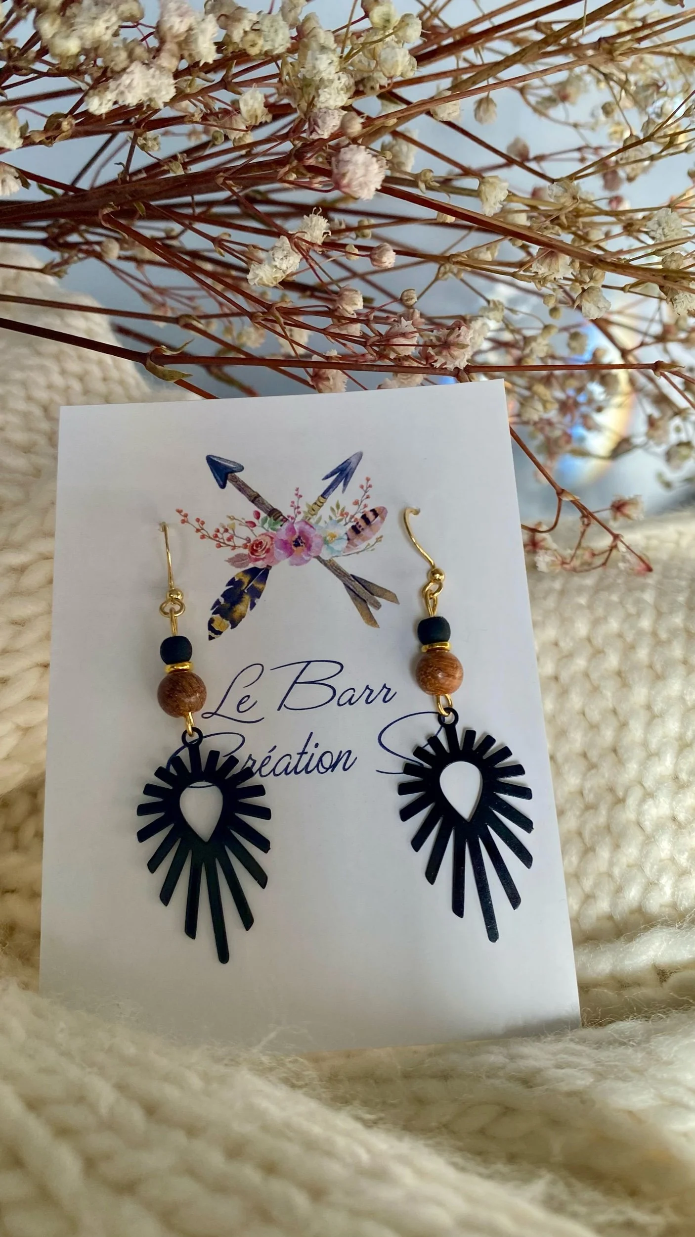 Les boucles Mystique Terre & Ombre unissent la chaleur apaisante du bois naturel à l’élégance intemporelle du noir mat. Leur pendentif rayonnant évoque l’équilibre entre lumière et obscurité, force et douceur.